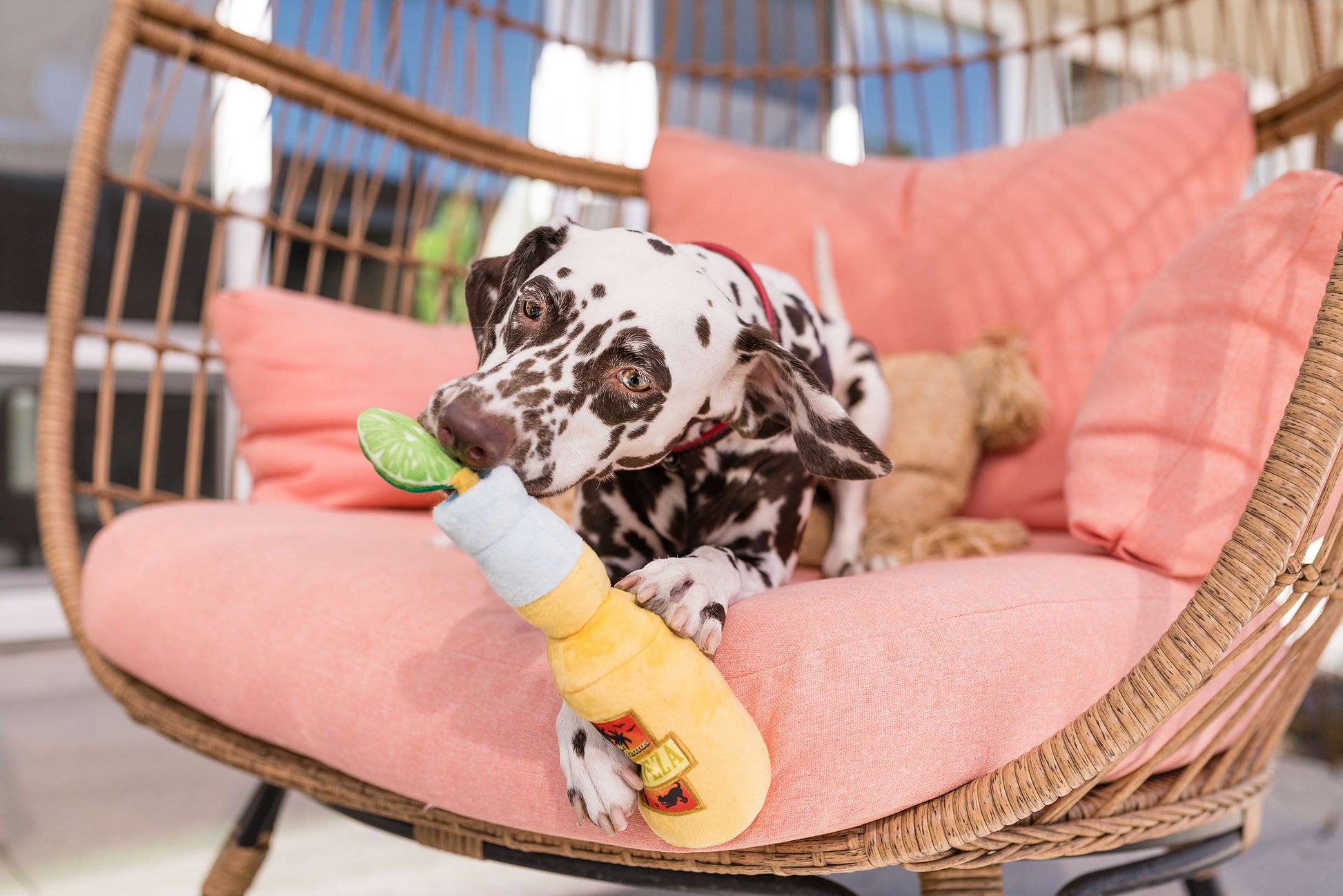 This squeaky “beer bottle” is perfect for cooling off after a long day of play. Tug the crinkly lime bungee, shake it for a silly squeak, and watch your dog have a giggle-worthy good time.